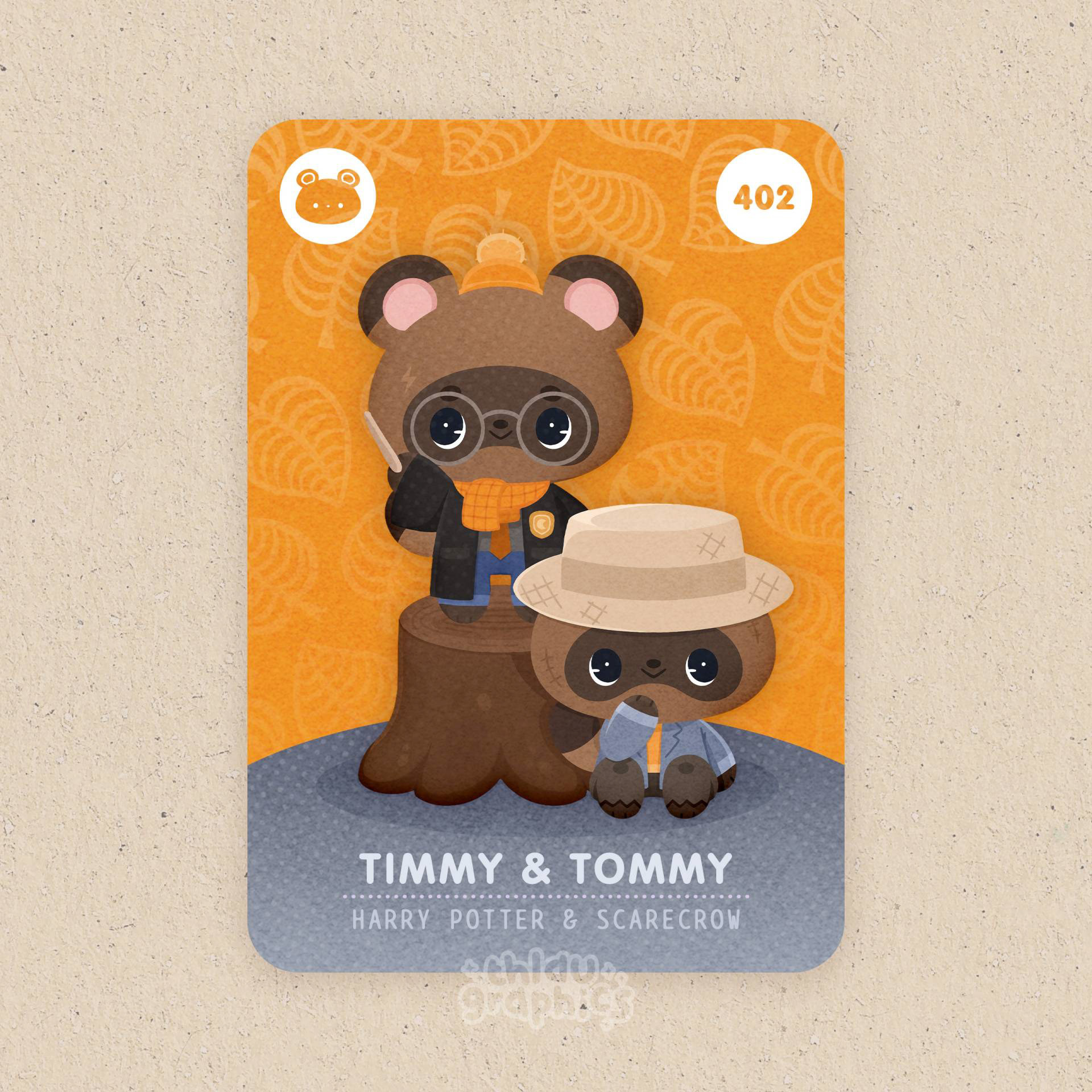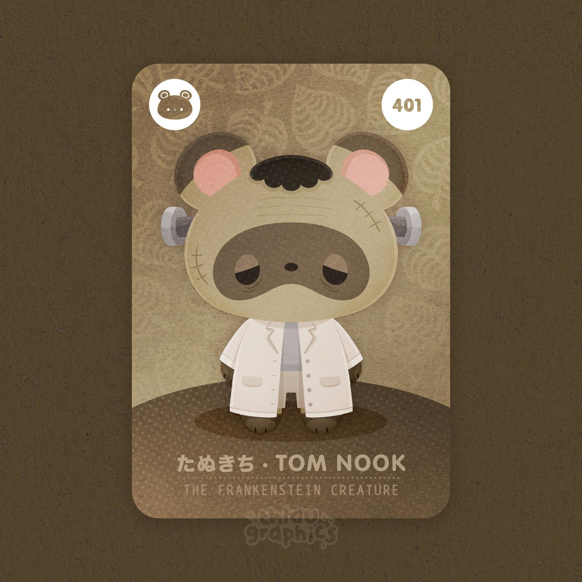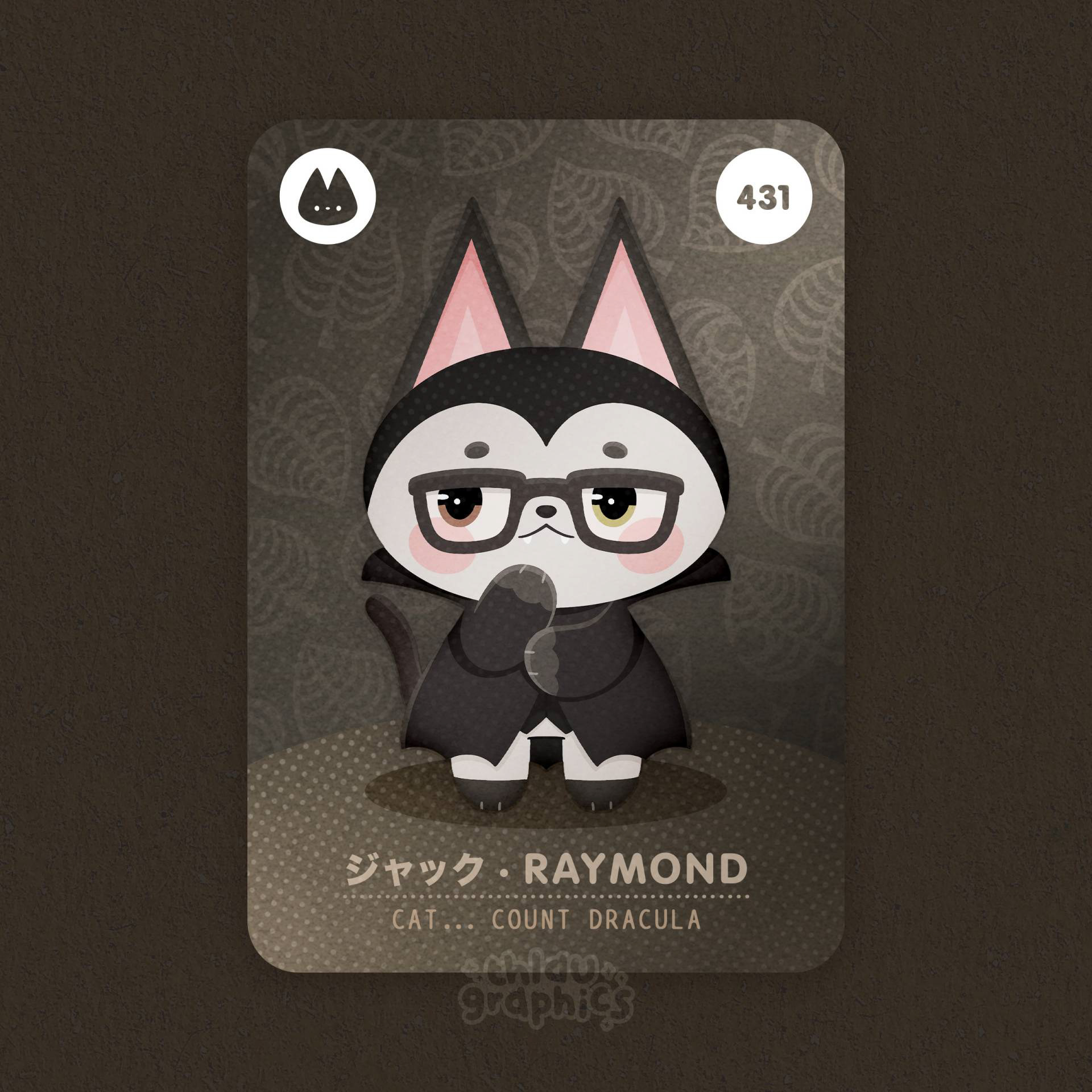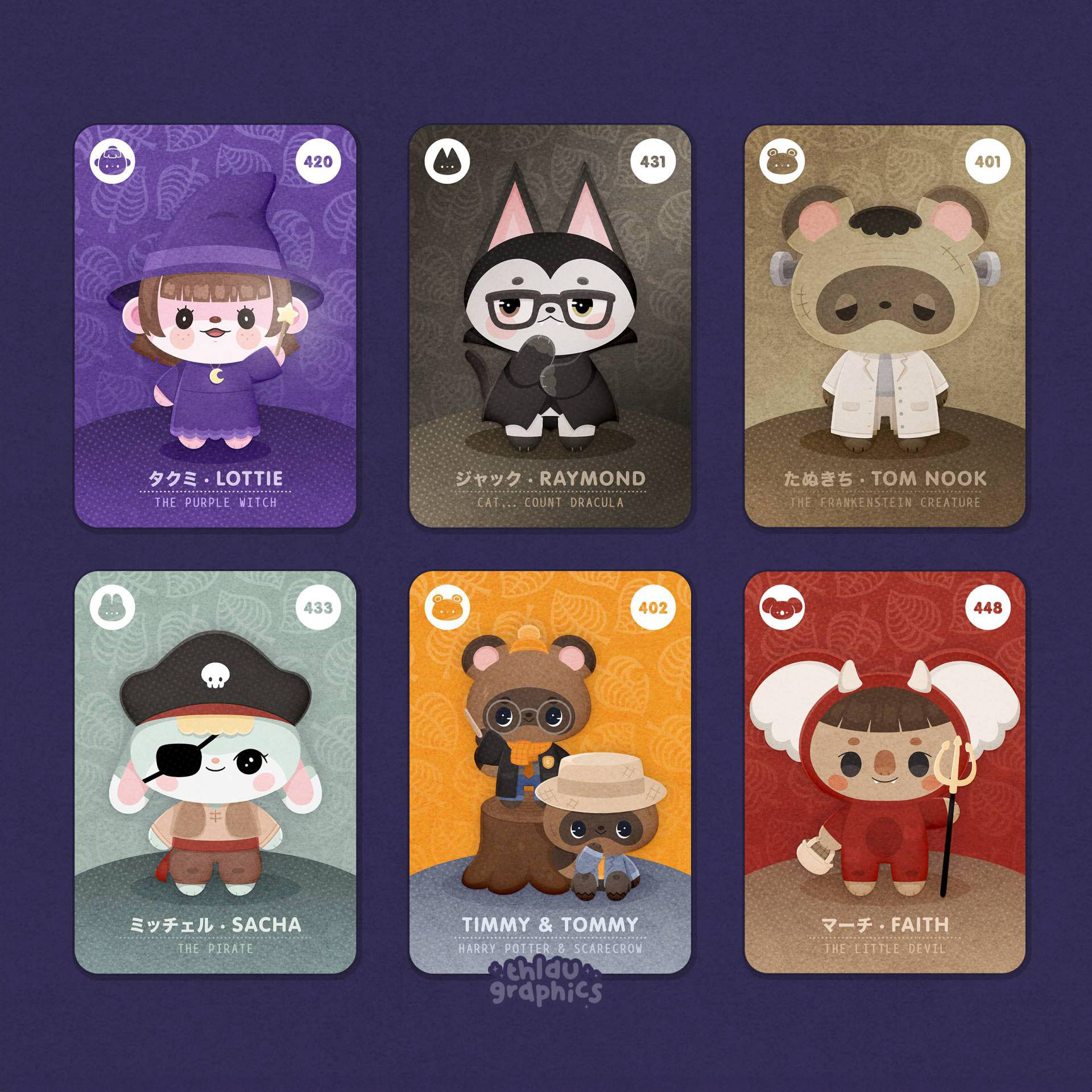 Fan art de personnages issus des jeux Animal Crossing habillés de costumes d'Halloween sous forme de carte "Amiibo", des cartes à collectionner qu'on peut scanner avec sa console.