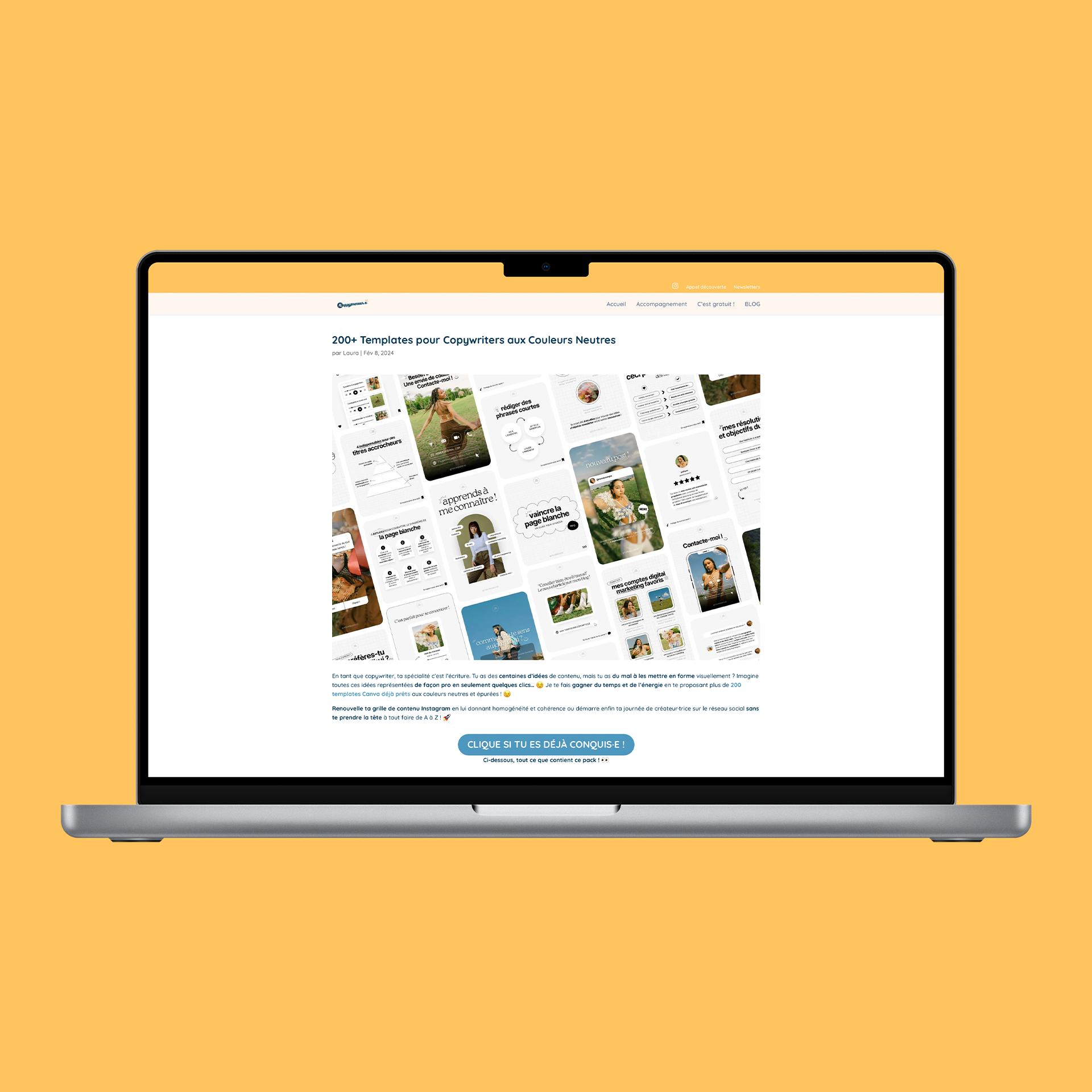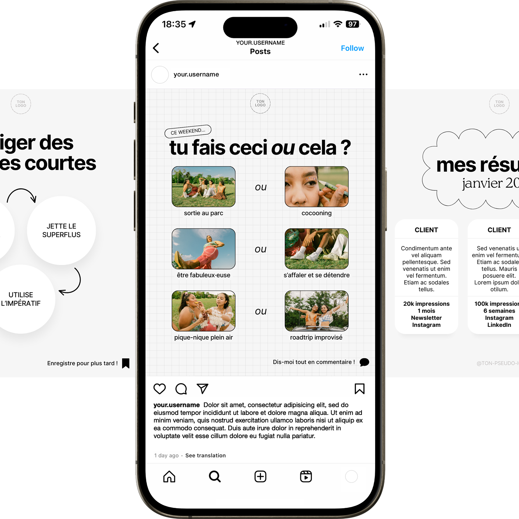 Modèles Canva destinés à la vente pour comptes Instagram autour du copywriting (stage chez Happypreneur·e).
