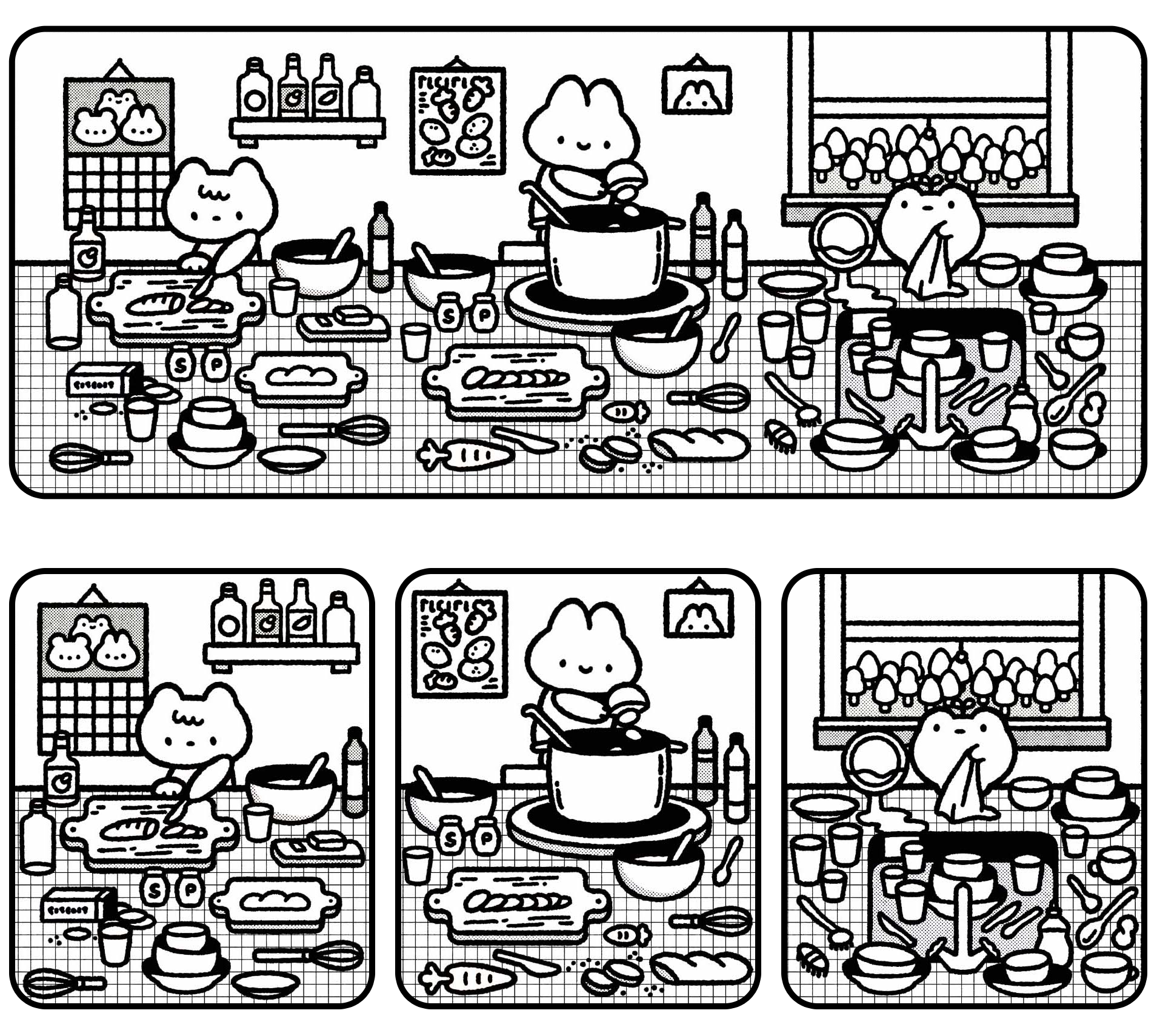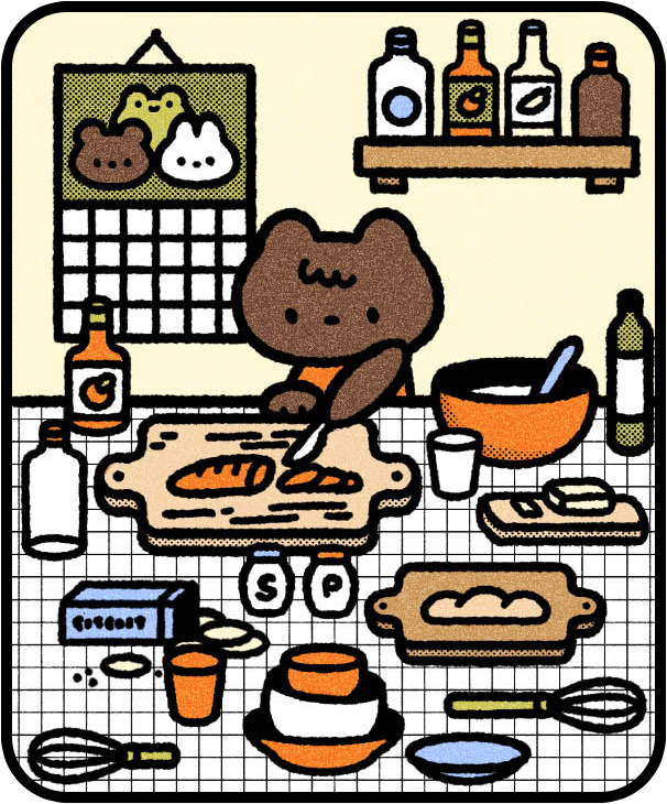 Ci-dessous, il y a Hachimitsu, un ours maladroit pas très à l'aise avec des objets pointus voire… n'importe quel objet en général. Fluffy le lapin qui a la mauvaise habitude de mettre de la carotte dans absolument tout. Après tout, on ne sait jamais ce qu'est un bon carrot cake jusqu'à en manger, mais du yaourt à la carotte est une autre histoire.