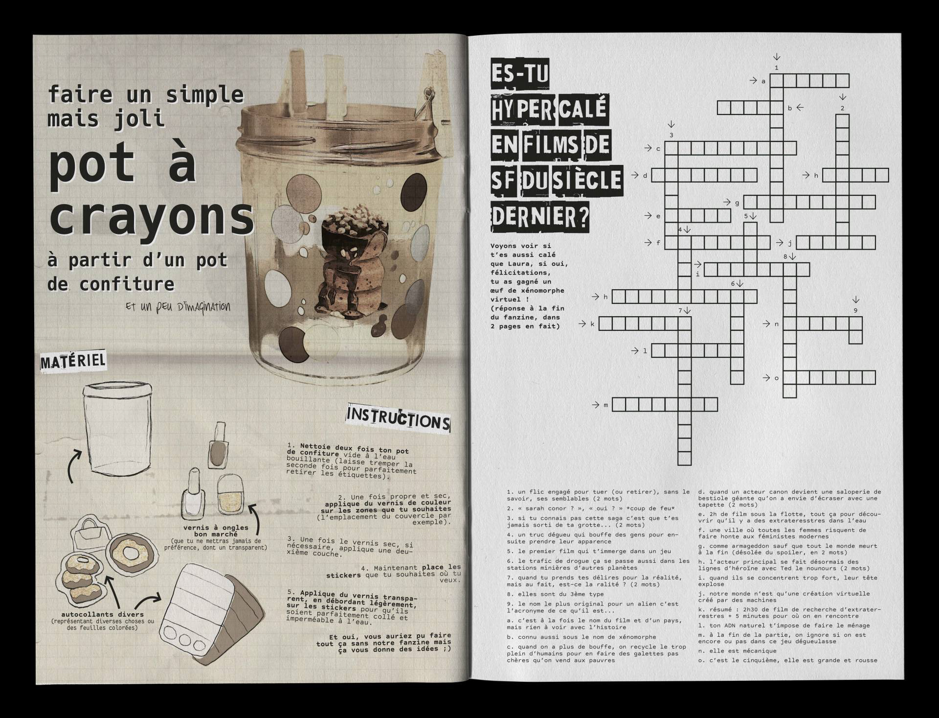 Le but de ce projet scolaire était de réaliser et mettre en page un court fanzine selon la théorie vue en classe en utilisant les outils et supports que nous voulions. J'ai mélangé des média physiques traditionnels avec du digital. Un de mes projets scolaires préférés car nous avions beaucoup plus de liberté créative. Manipulation et édition d'image fait dans Photoshop en utilisant des photos, morceaux de papier et autres éléments que j'ai réalisé et/ou scanné, mise en page finale faite dans InDesign.