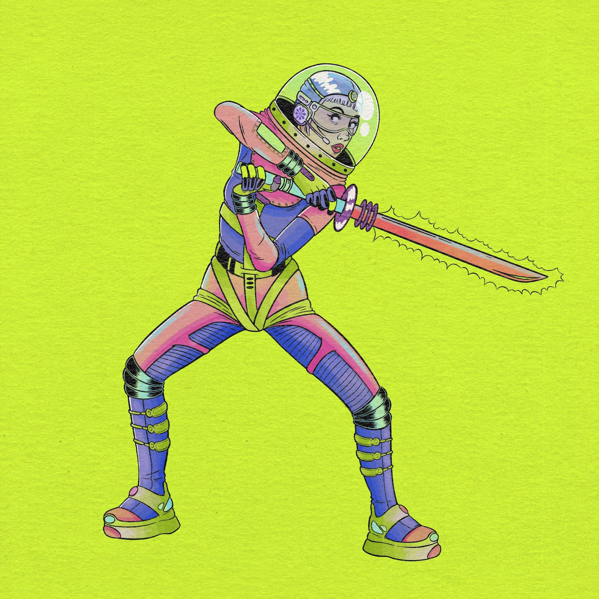 Illustration de quatre de demoiselles aux styles différents et couleurs électriques rappelant la tendance "retro-futuriste" et cyberpunk. Procreate.