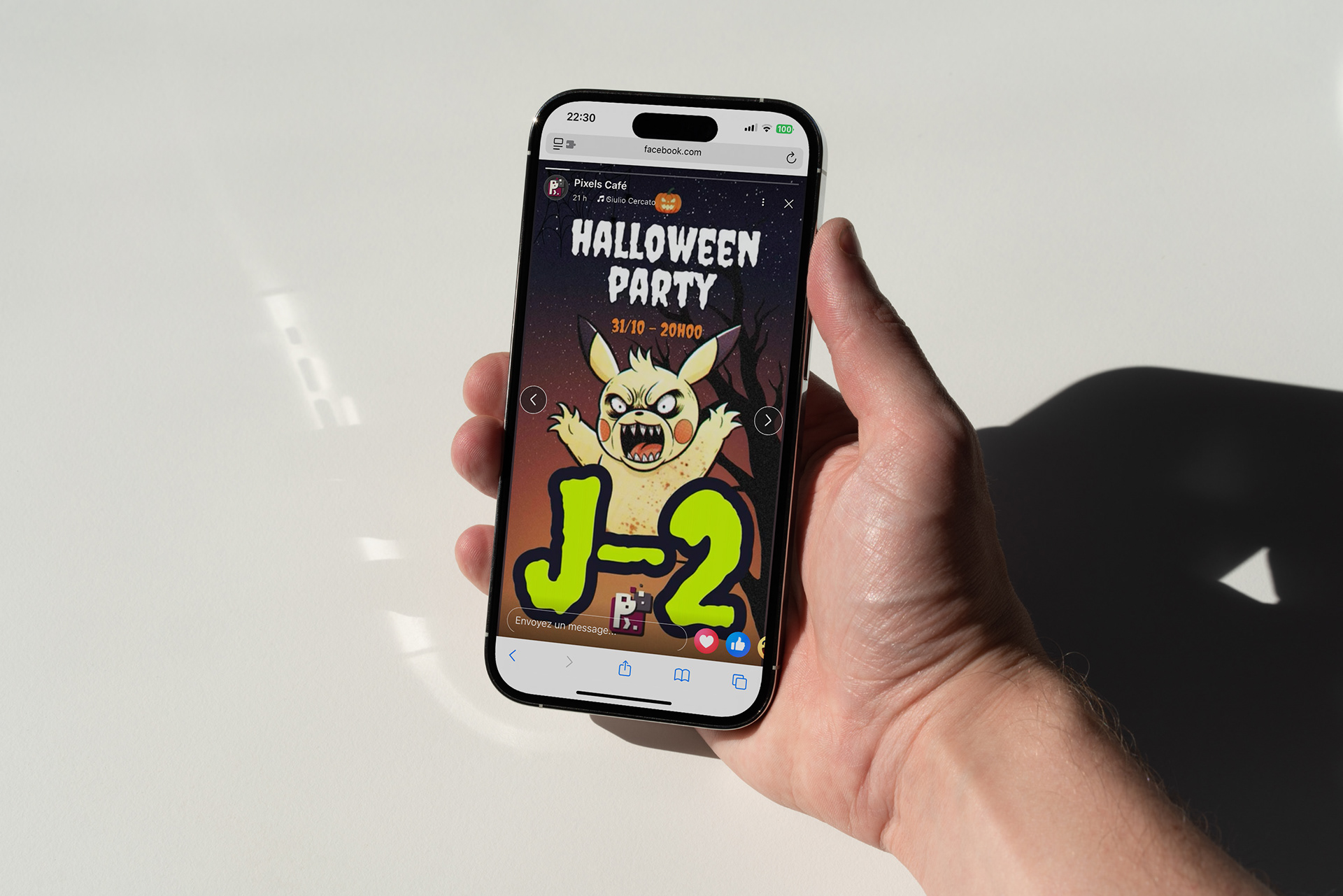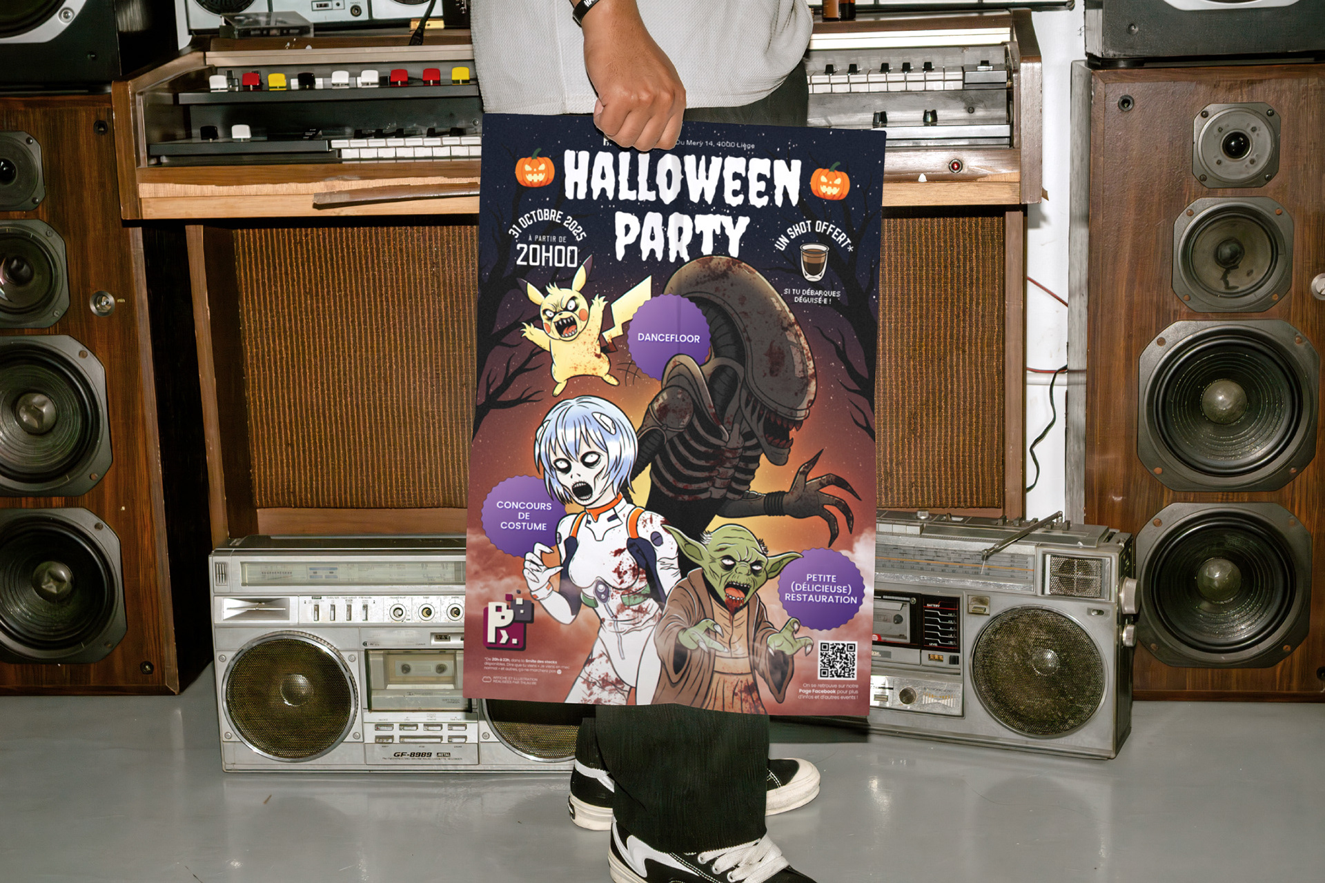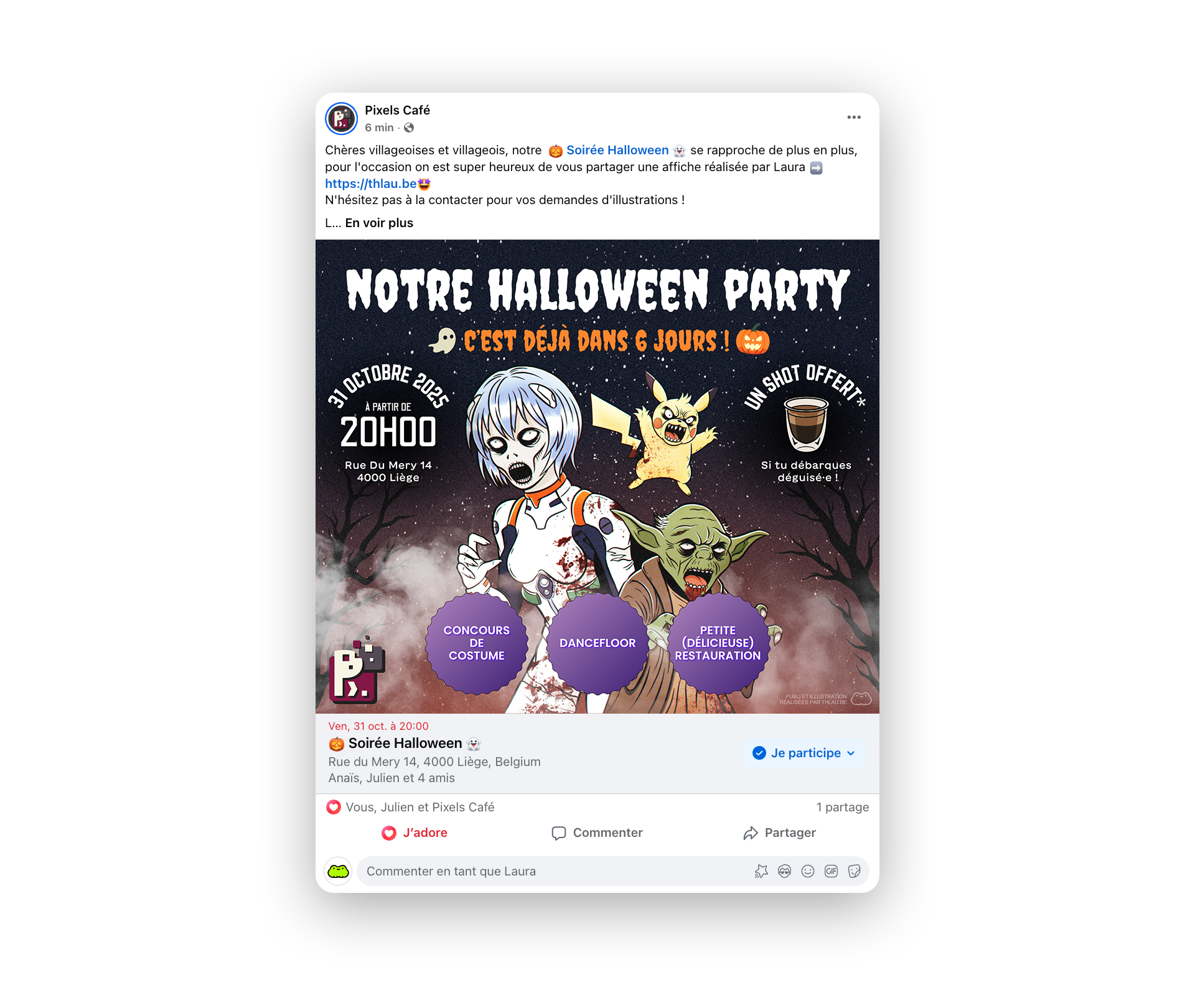 Affiche et publication réalisées pour la soirée Halloween 2025 du Pixels Café à Liège.