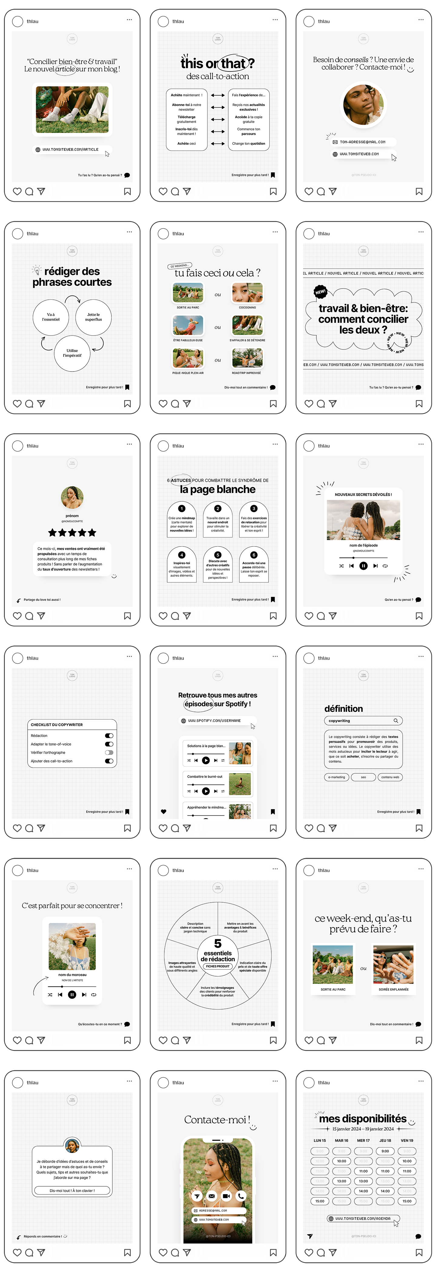 Succintement, mon processus a été de voir de quels sujets les copywriters parlaient sur leurs comptes Instagram, quel était le style visuel global (textuel, minimaliste et sans image) et à qui ils s'adressaient (aux entreprises ou à d'autres copywriters) puis d'adapter mes templates en conséquence tout en ajoutant des posts sans thème particulier qui se retrouvent habituellement dans les packs de templates en général, mais surtout pour générer de l'engagement et également sortir un peu du lot.
